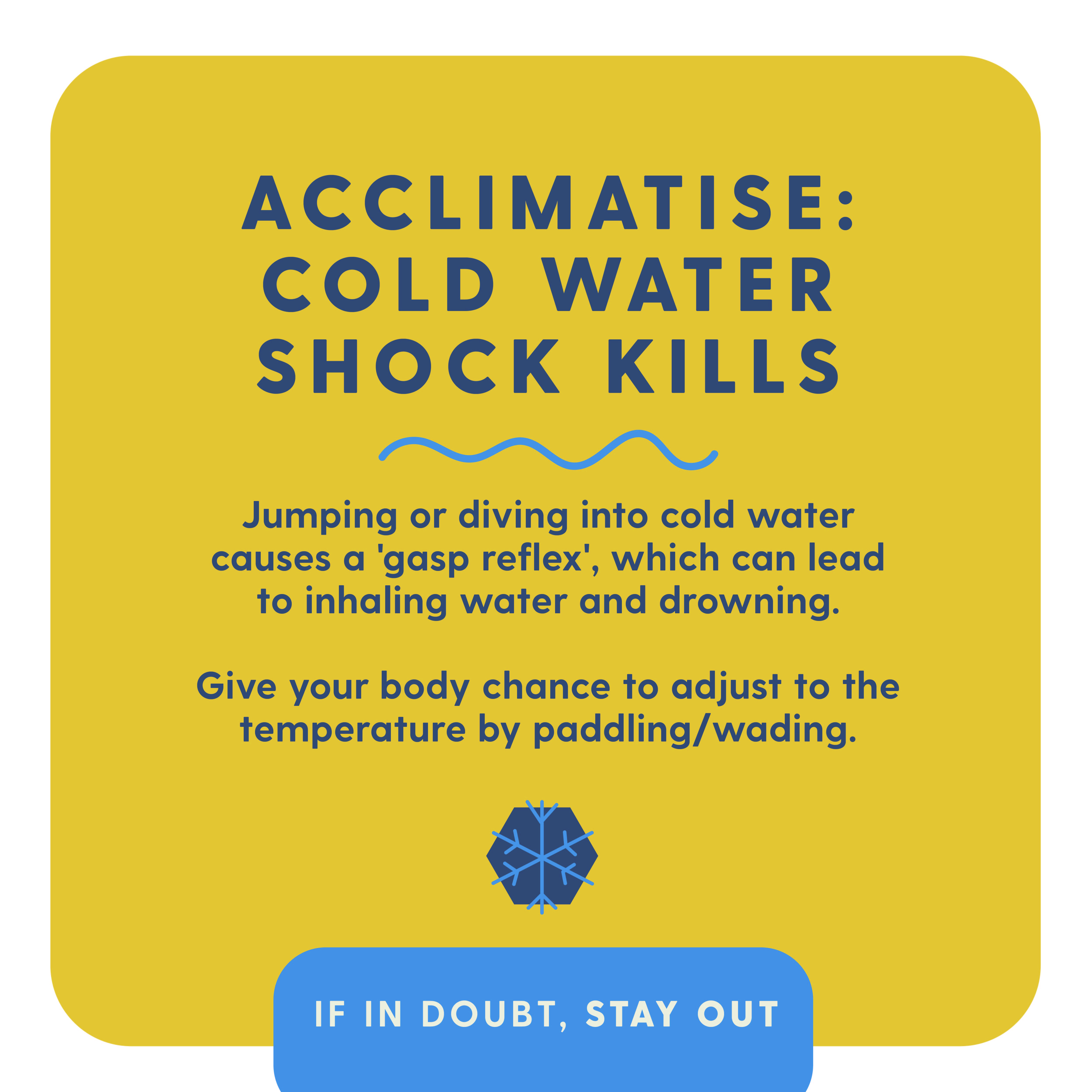Acclimatise: cold water shock kills – As hot as it may be on land, water bodies in Yorkshire remain very cold all year round. Jumping or diving into cold water can cause a gasp reflex, which can lead to panic and possibly drowning. Paddling/wading gives your body the chance to adjust to the temperature and helps reduce the risk.